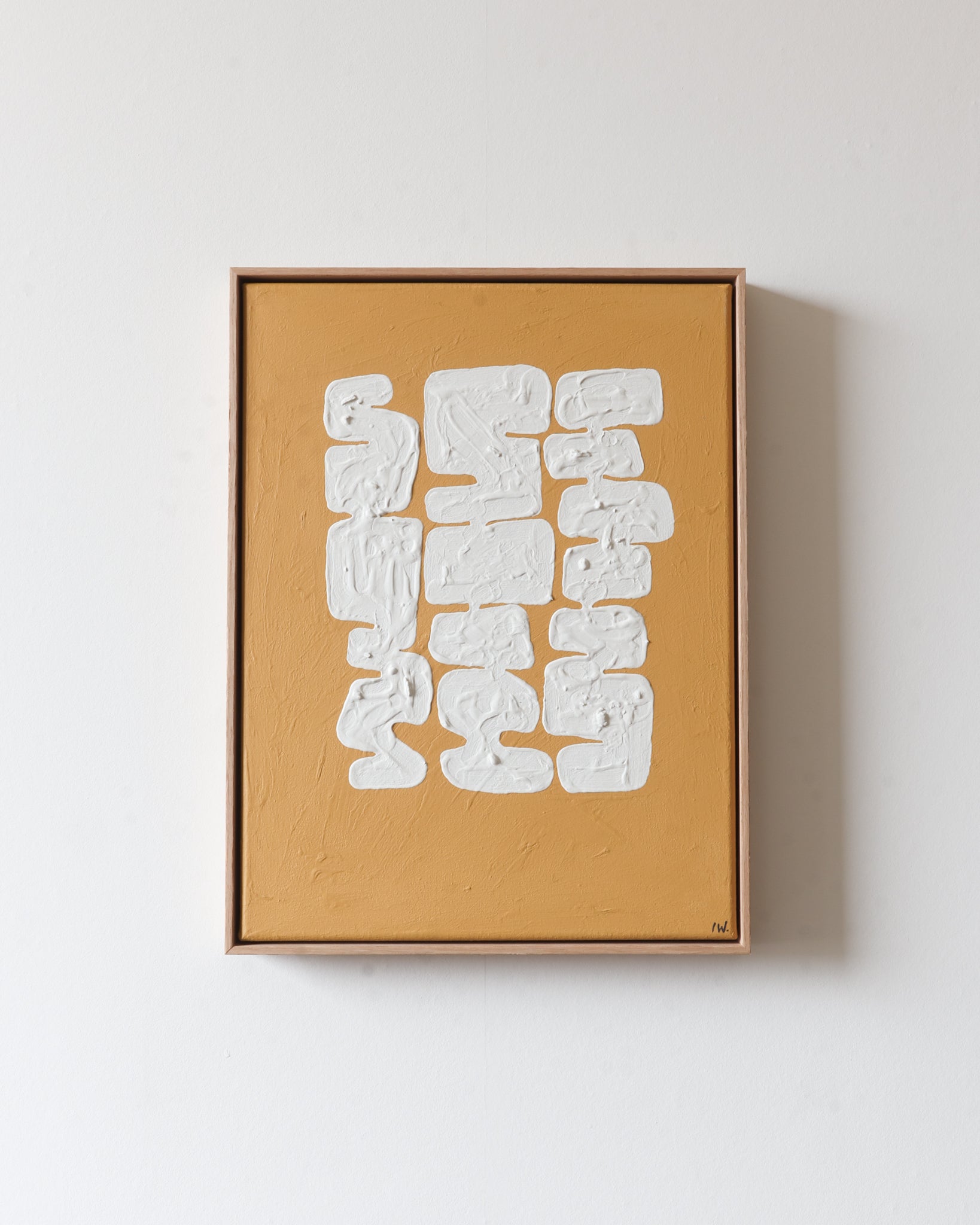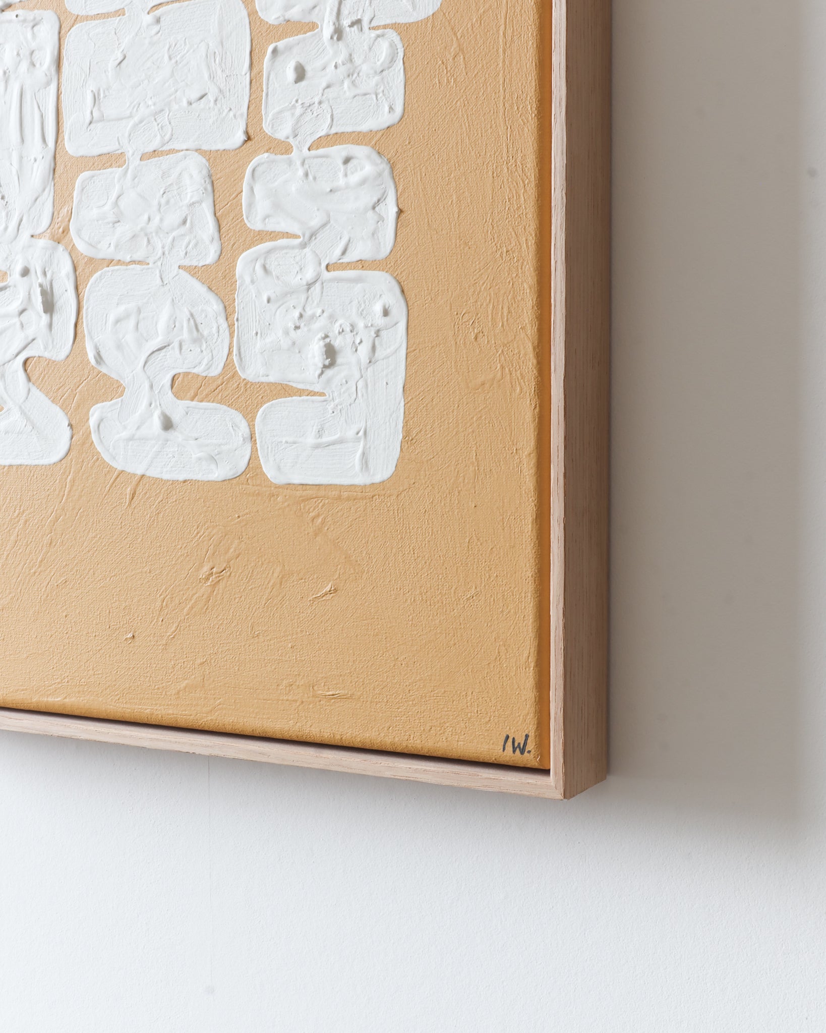Wit en oker vermengen zich, als de Melkweg die zich uitstrekt door de duisternis. Een moment van mysterie, waar licht en schaduw samen een oneindige reis maken.