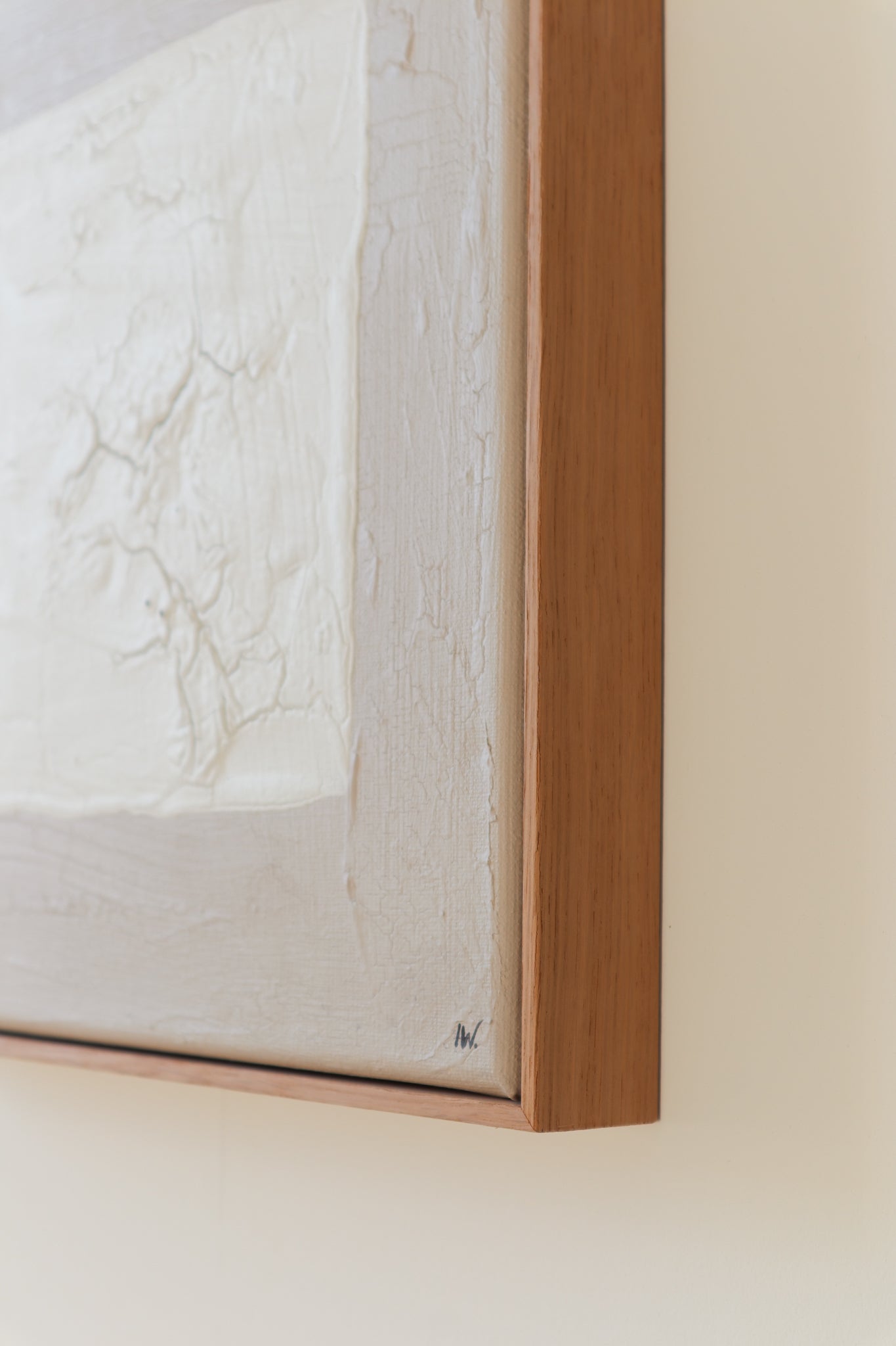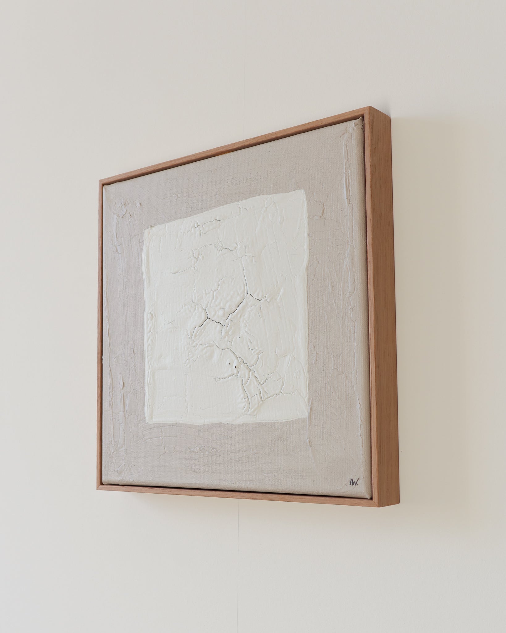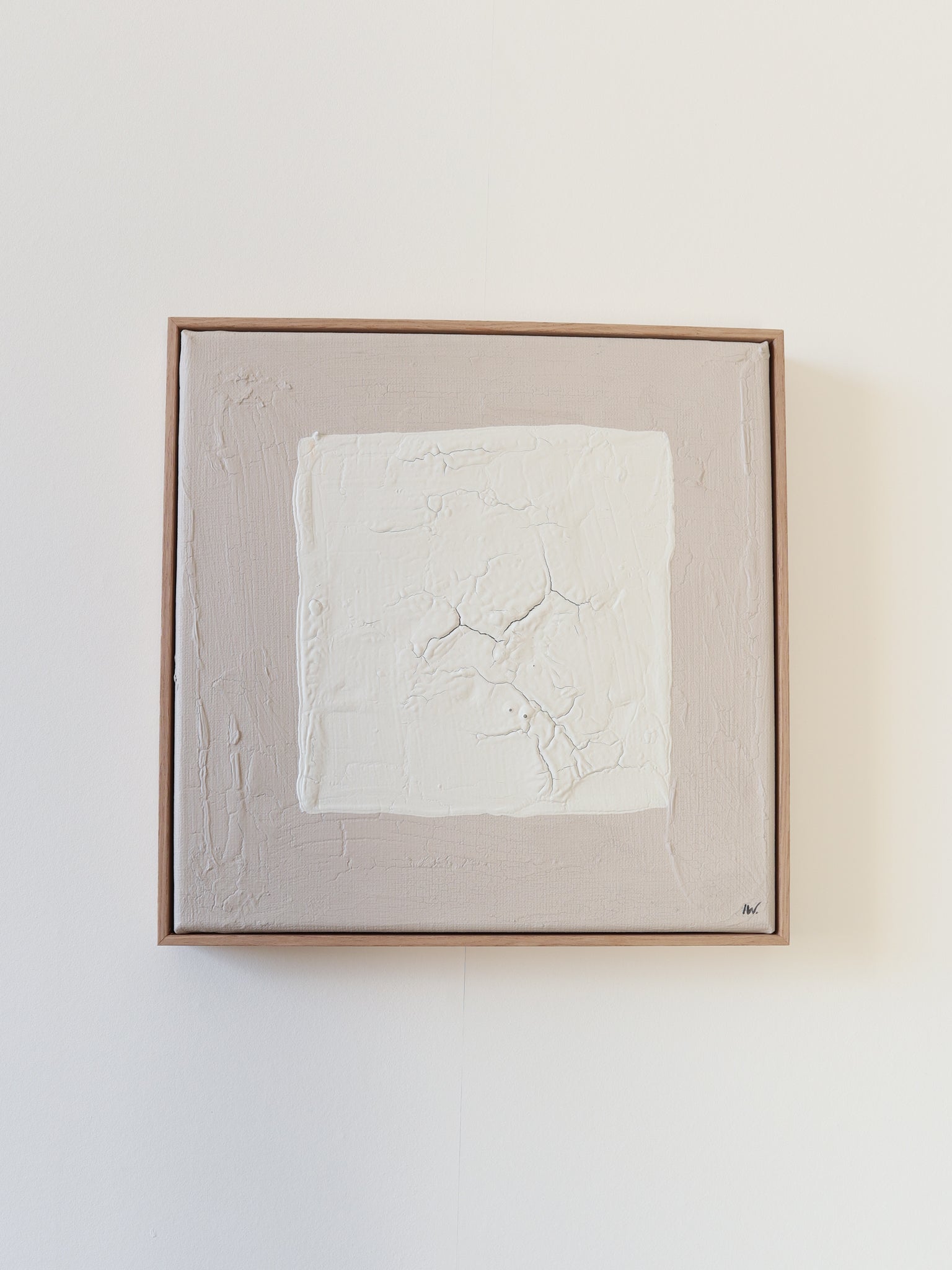 Een wit vierkant rust in de ruimte, omringd door stilte. De beige achtergrond houdt de adem in, wachtend op wat er zich binnen deze grenzen zal ontvouwen.